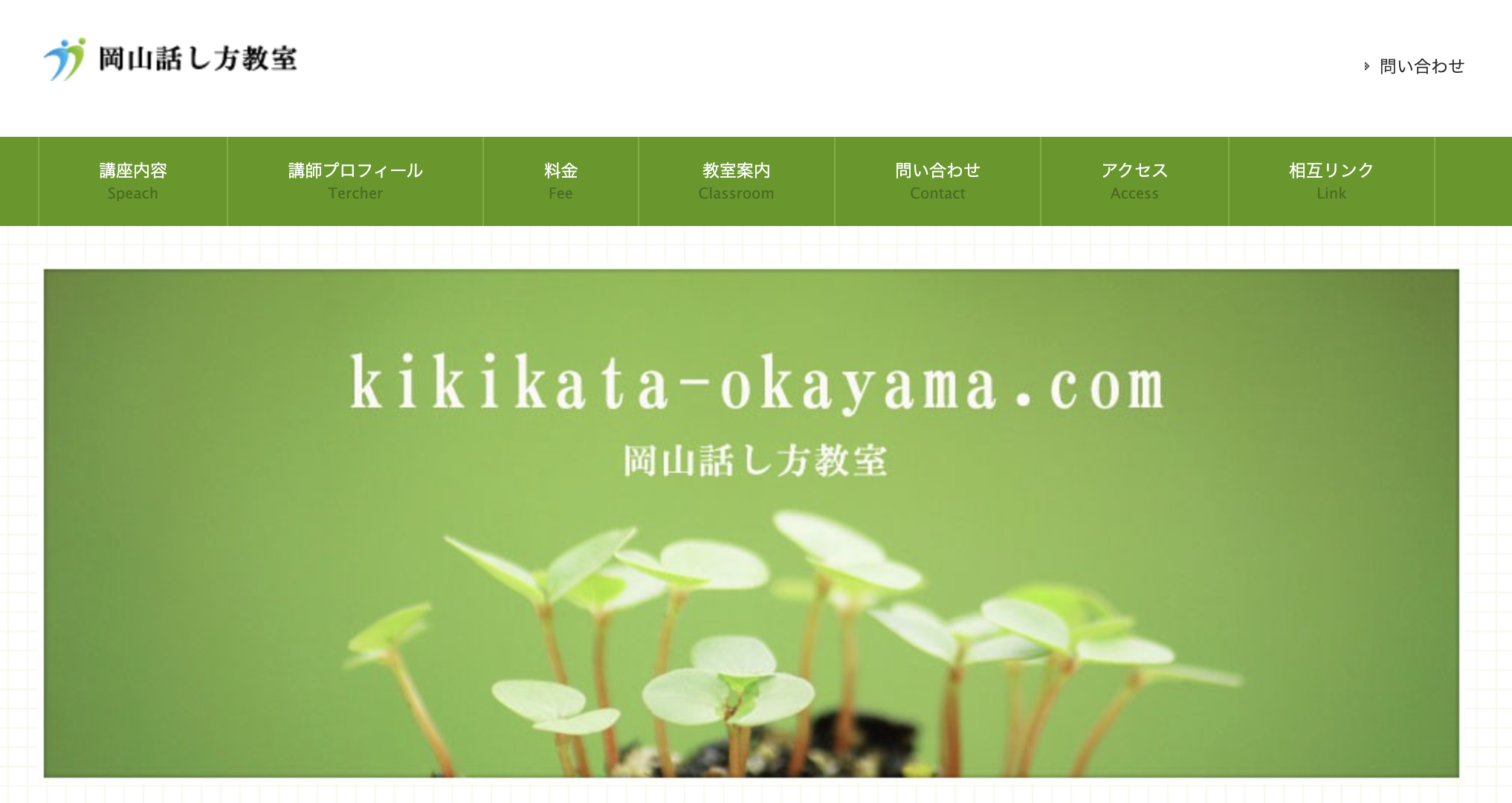 | 岡山話し方教室 | 岡山話し方教室は、元RSKアナウンサーが講師を務める教室です。スピーチやディスカッションの実践を通して、あがり症克服や滑舌改善を図ります。グループレッスンで、「会話を楽しむ」ことを重視した指導が特徴です。 | 3,000円 | 詳細を見る |
