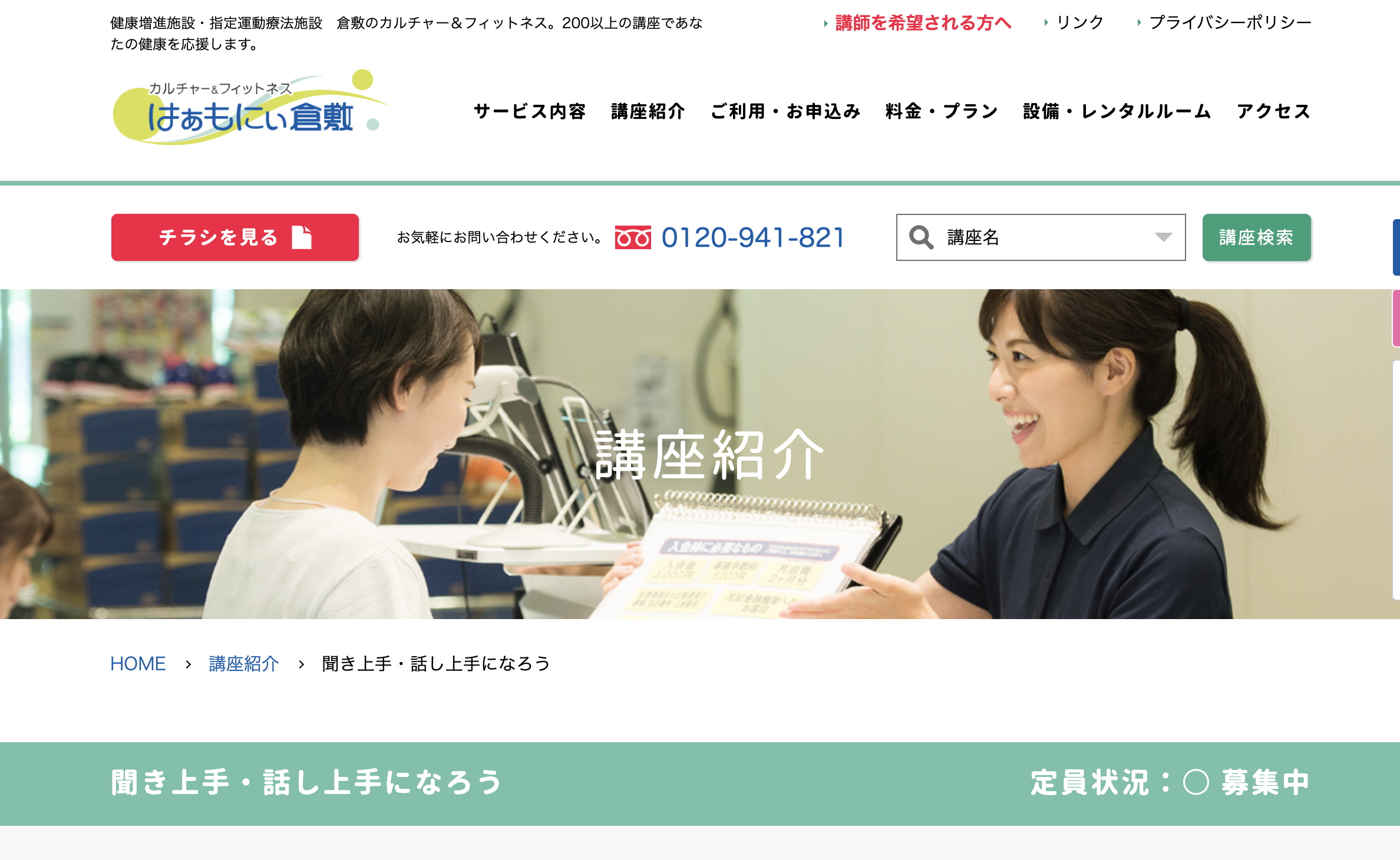 はぁもにぃ倉敷で開講されている話し方講座です。フリーMCの高田直美氏を講師に迎え、日常やビジネスに不可欠な「聞く力」と「話す力」をバランスよく磨きます。テキストは使わず、スピーチや朗読、ディスカッションなどの実践練習を通して、個々の癖や特性に合わせた指導を行うのが特徴です。会話のキャッチボールを円滑にしたい方にお勧めで、第2・4水曜の夜に開催されています。